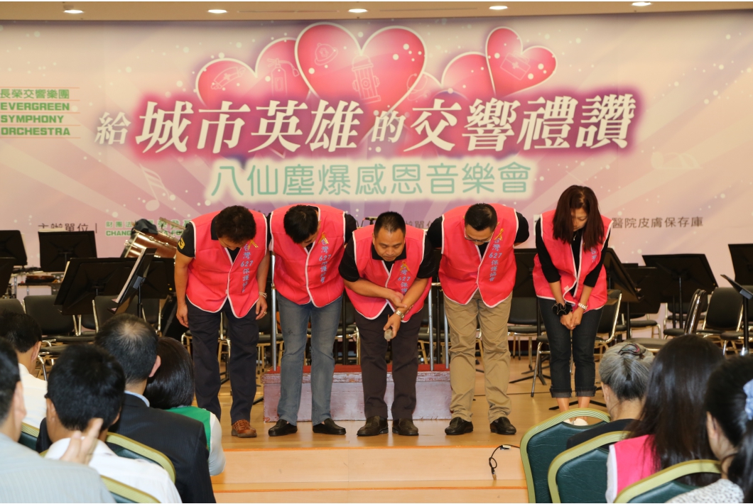由長榮交響樂團與八仙塵爆的傷友及多位知名歌手、音樂家共同擔綱演出,邀請近700位塵爆傷友、家屬及默默付出的城市英雄蒞臨欣賞。新北市長朱立倫、副市長侯友宜、衛福部醫事司副司長商東福、八仙受害者保護協會理事長吳聲彣、台大醫院副院長林明燦等貴賓今天也出席音樂會,共同為傷友加油打氣。朱市長致詞時表示:「去年的6月27日是我們永遠不會忘記的日子,感謝社會各界及張榮發慈善基金會在八仙塵爆發生的第一時間伸出援手,還有許許多多不眠不休、無怨無悔的城市英雄,我們將共同持續努力,也希望未來不再有人受害。」保護協會理事長吳聲彣表示:「如果沒有你們這些城市英雄的幫忙,我不曉得這些家屬及傷者該如何。」也率領4位理事上台對城市英雄、企業、民間團體及社會每個角落的愛心深深一鞠躬。