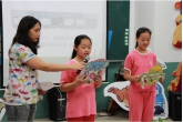 校長彭煥章首先以吉他吟唱帶有抒情與趣味的客家歌謠為捐贈儀式開場後,基金會把陽光愛心早餐支票贈送給副縣長徐柑妹。最近獲得客家山歌比賽優等獎的北埔國小歌謠隊,也特地表演客家平板山歌、媽媽的叮嚀,以輕快舞曲表達出對媽媽的愛。