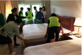 經過一天的戰鬥訓練,孩子們昨日抵達基隆桂冠酒店時,便能指出港邊的貨櫃說:「這是20呎、那是40呎,白色的是冷凍櫃!」經過一夜好眠,6日早上特別透過酒店安排,參加管家達人實習,瞭解送餐、鋪床整房等飯店相關服務流程,讓有心從事餐旅學生收穫良多,同學們大呼:「把房間整理的這麼乾淨,真是超有成就感啊!」;少年之家廖夏慧主任說:「以後大家的房間也要以這樣的標準整理」,為了體認更多元的職涯選擇,飯店也讓同學們跟著工務人員進行安全巡檢作業,同時教導建築物環境安全觀念,讓大家知道這也是一項職業選擇,有孩子回應:「以後到公共場所,就知道那裡安不安全了」。