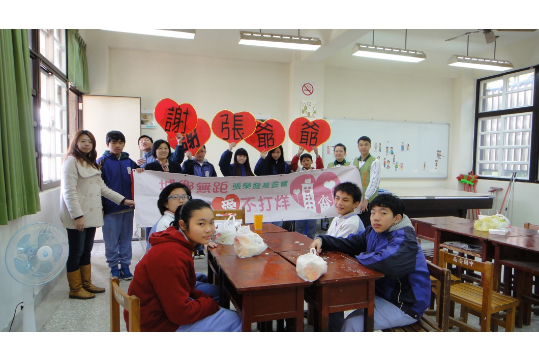本會於日前贊助蘇澳鎮南安國中早晚餐、大同鄉大同國小晚餐,大同國中交通費,並於開學後辦理關懷活動,首站南安國中訪談早餐店,老闆表示:「有些孩子以前只敢點一杯豆漿,現在有了張爺爺的餐費,可以點蛋餅、三明治、漢堡,同學不再餓肚子。而且為了鼓勵孩子吃早餐,也加碼給予餐費優惠」,林惠珠校長也透露:「有些孩子以前因為早晚餐不穩定,午餐都盡量吃的很撐;現在有 張總裁的補助,三餐正常了,身體不會打壞,更愛來學校!」。