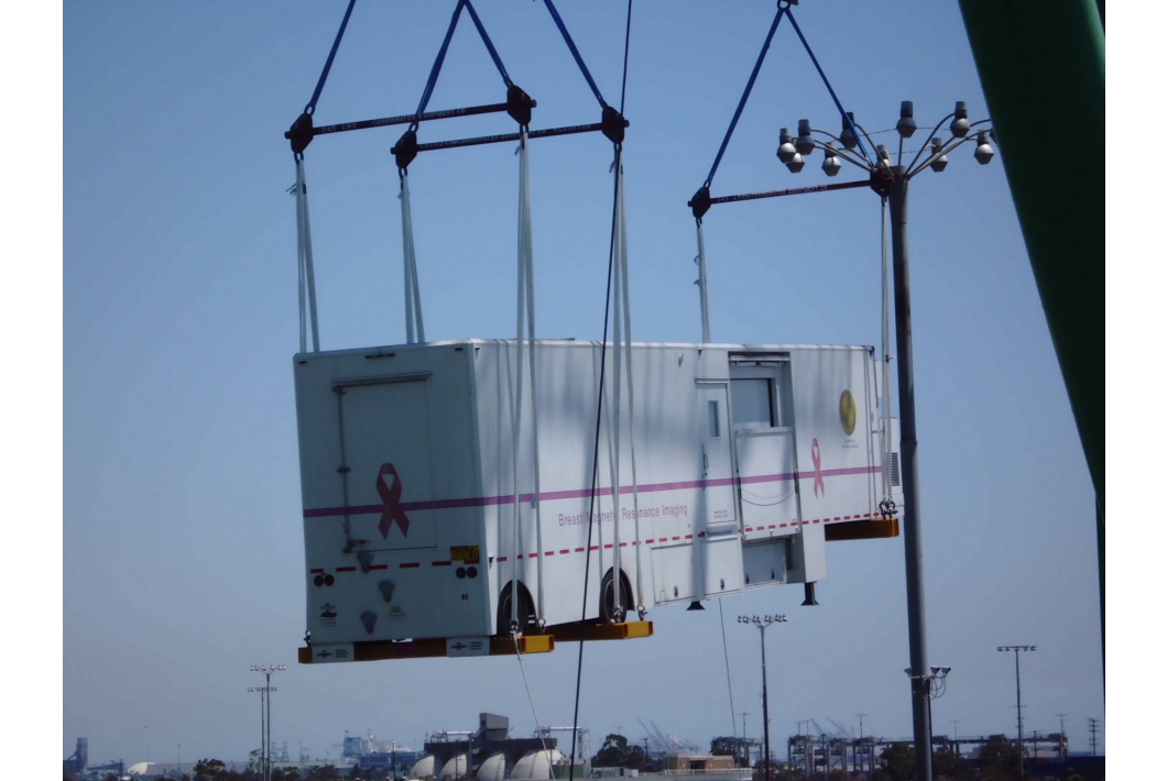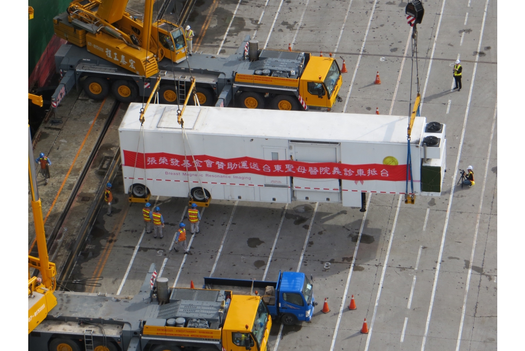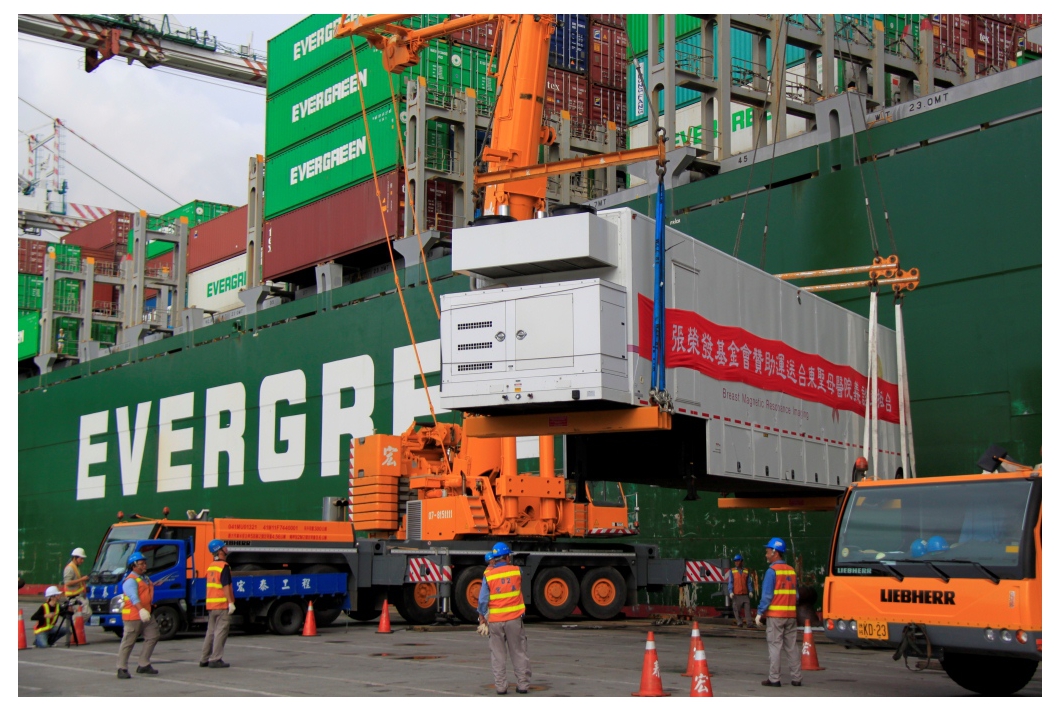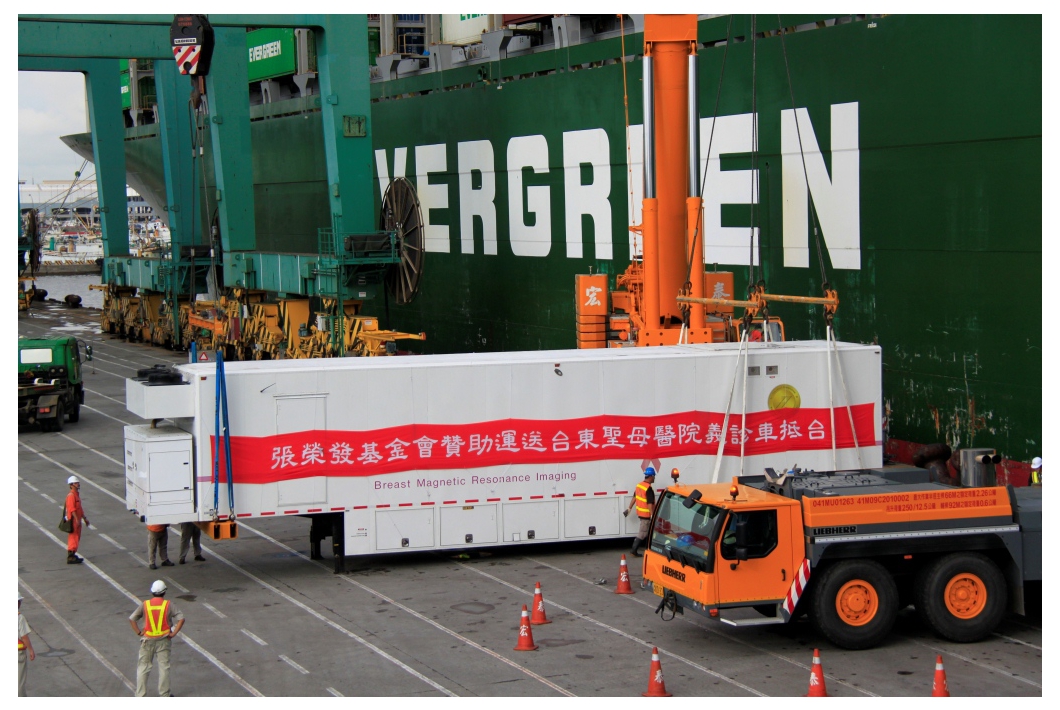 因該行動車為高科技精密超規貨載,無法裝入貨櫃且限制頗多,須特別安排裝卸機具、拖車、訂製特殊板架、變壓器及進行報關等事宜,亦為海運第一次承運該類貨品,故長榮集團長榮物流、長榮海運企劃、船務、工務及儲運等單位,經過多次密集開會及確認各項細節後,於4/26裝船,本次費用包含運費、材料、測試及報關費等,共計新台幣500萬元。經過20多天的海上航程,行動車終於在眾人的期盼下抵達高雄港長榮專用碼頭,當天早上還是大雨滂沱,但是卸貨的預訂時間一到,天空突然轉晴,視線相當良好,非常利於船邊作業進行。基金會於運抵當天親自在碼頭督導卸貨事宜,相關單位也於當天全體總動員,發揮長榮團隊合作精神,緊密聯繫及溝通協調,將行動車安全順利送抵台東。台東聖母醫院陳良娟副院長非常感謝 張總裁慷慨的協助,捐贈的美商 CEO Olivia女士亦特別致電表示「非常滿意你們專業的行動和衷心的努力,橫跨浩瀚的太平洋,將MRI行動車安全地交付台灣」。