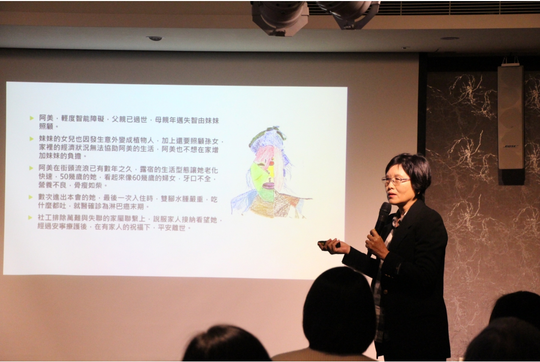 長期關懷「女性無家者」的台中撒瑪黎雅婦女關懷協會執行長楊麗蘋分享許多無家者背後都有不得已的理由,例如精神障礙、慢性疾病、先天不正常家庭教育造成。而女性無家者,更是弱勢中的弱勢,流落街頭常面臨人身安全威脅,但很多人其實都是有工作,只是收入太少讓他們無法有家,真的需要你我溫暖的擁抱,讓她們有信心改變徬徨的靈魂。