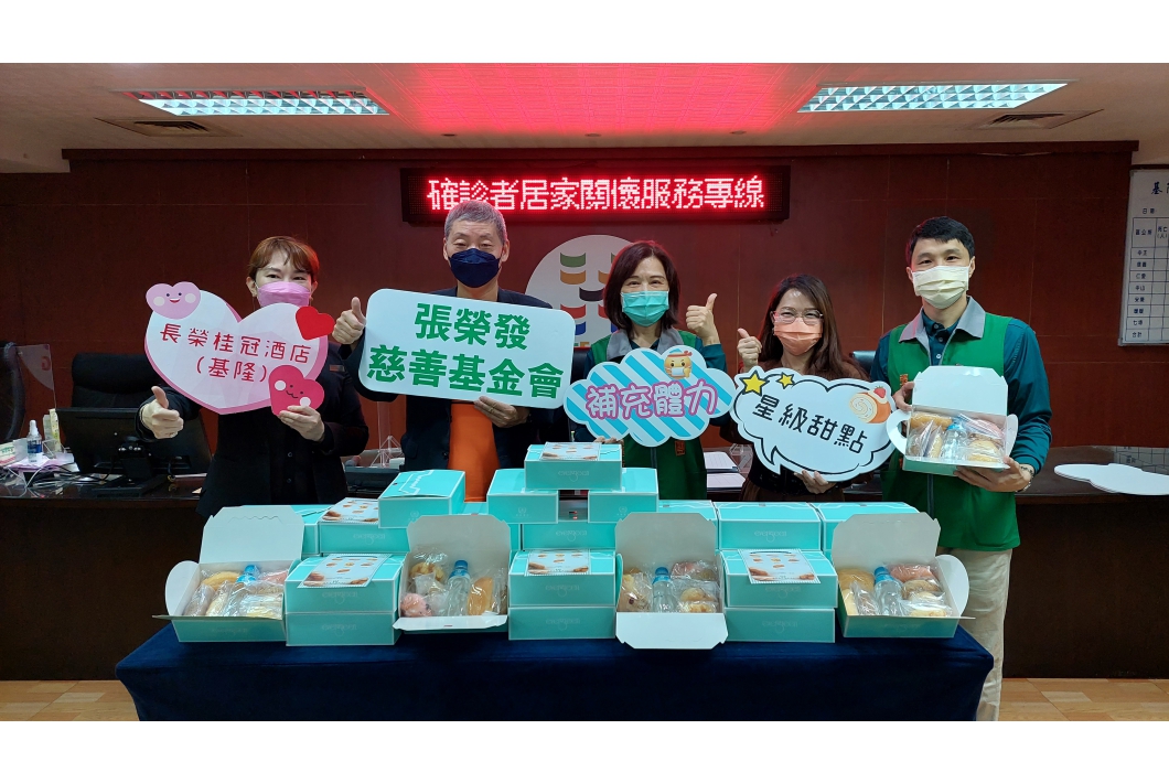 因應居家隔離民眾需求,基隆市成立「居家關懷照護中心」,但是短短一個月,確診人數從100多例成長到每日平均2,000多例,隔離人數也大幅上升,中心工作量遽增;為傳達社會對防疫工作的支持,張榮發慈善基金會與長榮桂冠酒店(基隆)攜手,透過致贈酒店精心客製的麵包餐盒,為第一線日夜工作的中心人員打氣加油。