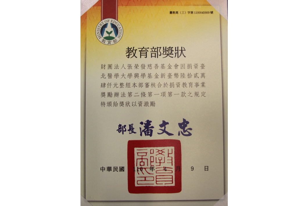 本會長期贊助公益計劃有成,感謝教育部「捐資教育事業」獎項的肯定,今日由吳景明董事長代表慈善基金會授獎表揚,今後也將持續協助弱勢族群及學子、更積極展開社會公益計劃,為台灣更美好的未來而努力。