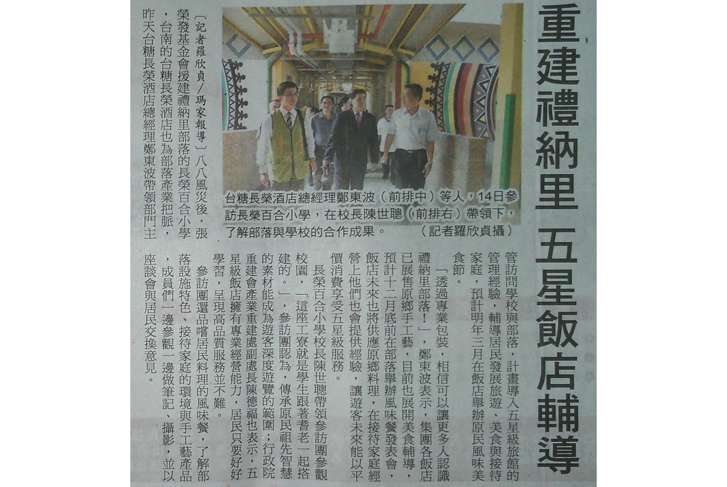 2012年11月14日在張榮發慈善基金會與行政院重建會陪同下,台糖長榮酒店百忙中由鄭總經理親自領率飯店餐廳、客務、房務、主廚、公關部門5位一級主管至禮納里進行住房、餐飲、工藝體驗方面的檢視,並立刻於現場座談中提出全方位軟硬體改善建議。