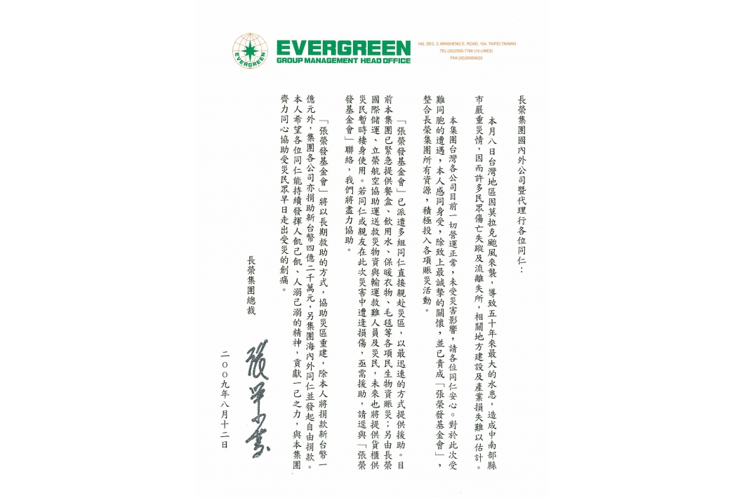 八月八日風災南部傳出災情,基金會隨即在八月九日赴嘉義縣民雄鄉勘災,並提供受災戶五千一百份餐盒。八月十一日再派遣三批訪查員前往嘉義縣民雄鄉、台南縣大內鄉及屏東縣新園鄉了解災情。張總裁當時強調,雖然景氣不佳,但企業還是應該發揮人饑己饑、人溺己溺的精神來救助災民,因此他個人將捐助新台幣一億元,集團各公司將會捐助新台幣四億二千萬元,並發起集團海內外員工自由樂捐,以最直接、迅速的方式參與各項賑災。